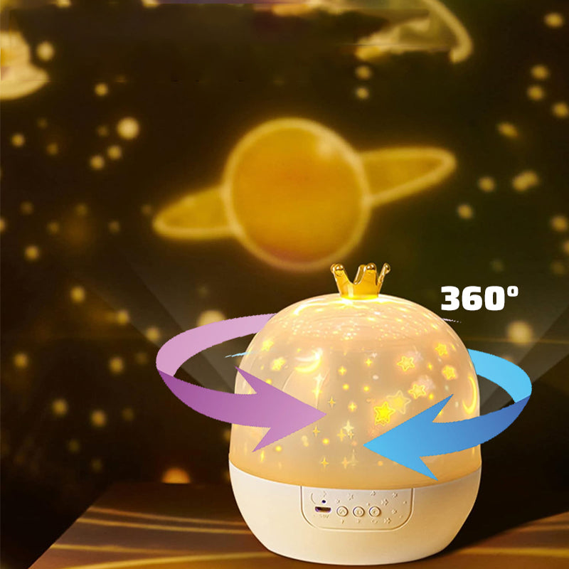 360° въртене: Прожекторът предлага общо шест режима на осветление (едноцветни и смесени цветове): бял, син, жълт, режим „сън“, режим „течаща светлина“ и режим „пълна светлина“. Благодарение на 360-градусовото въртене ефектът на прожектирането е по-романтичен и магичен. Можете да създадете пред децата си вълшебно движещо се звездно небе, блестящи и романтични съзвездия, тайнствен и красив океански свят.