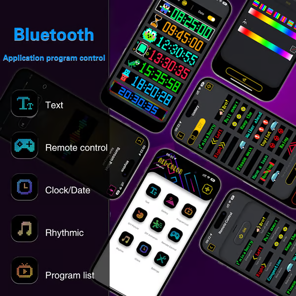 LED Π΄ΠΈΡΠΏΠ»Π΅ΠΉΡΡ ΡΠ΅ ΡΠΏΡΠ°Π²Π»ΡΠ²Π° ΡΡΠ΅Π· ΠΏΡΠΈΠ»ΠΎΠΆΠ΅Π½ΠΈΠ΅, ΡΠ²ΡΡΠ·Π°Π½ΠΎ ΠΏΠΎ Bluetooth, ΠΊΠΎΠ΅ΡΠΎ ΠΏΠΎΠ΄Π΄ΡΡΠΆΠ° ΡΠ²ΡΡΠ·Π²Π°Π½Π΅ Π½Π° ΠΌΠ½ΠΎΠΆΠ΅ΡΡΠ²ΠΎ LED Π΄ΠΈΡΠΏΠ»Π΅ΠΈ Π΅Π΄Π½ΠΎΠ²ΡΠ΅ΠΌΠ΅Π½Π½ΠΎ, ΠΏΡΠ°Π²Π΅ΠΉΠΊΠΈ Π²Π°ΡΠ΅ΡΠΎ ΠΌΡΡΡΠΎ ΠΏΠΎ-ΠΏΡΠΈΠ²Π»ΠΈΡΠ°ΡΠΎ Π²Π½ΠΈΠΌΠ°Π½ΠΈΠ΅ΡΠΎ. ΠΡΠΈΠ»ΠΎΠΆΠ΅Π½ΠΈΠ΅ΡΠΎ Π²ΠΊΠ»ΡΡΠ²Π° ΠΌΠ½ΠΎΠΆΠ΅ΡΡΠ²ΠΎ Π·Π°Π±Π°Π²Π½ΠΈ ΡΠ΅ΠΆΠΈΠΌΠΈ ΠΈ Π°Π½ΠΈΠΌΠ°ΡΠΈΠΈ. Π‘ ΡΠ΅Π»Π΅ΡΠΎΠ½Π° ΡΠΈ ΠΌΠΎΠΆΠ΅ΡΠ΅ Π»Π΅ΡΠ½ΠΎ Π΄Π° ΠΏΠ΅ΡΡΠΎΠ½Π°Π»ΠΈΠ·ΠΈΡΠ°ΡΠ΅ ΡΠ°Π±Π»ΠΎΠ½ΠΈ ΠΈ Π·Π°Π±Π°Π²Π½ΠΈ ΡΠ΅ΠΊΡΡΠΎΠ²Π΅, Π·Π° Π΄Π° ΠΈΠ½Π΄ΠΈΠ²ΠΈΠ΄ΡΠ°Π»ΠΈΠ·ΠΈΡΠ°ΡΠ΅ ΡΠ²ΠΎΠ΅ΡΠΎ ΠΌΡΡΡΠΎ.